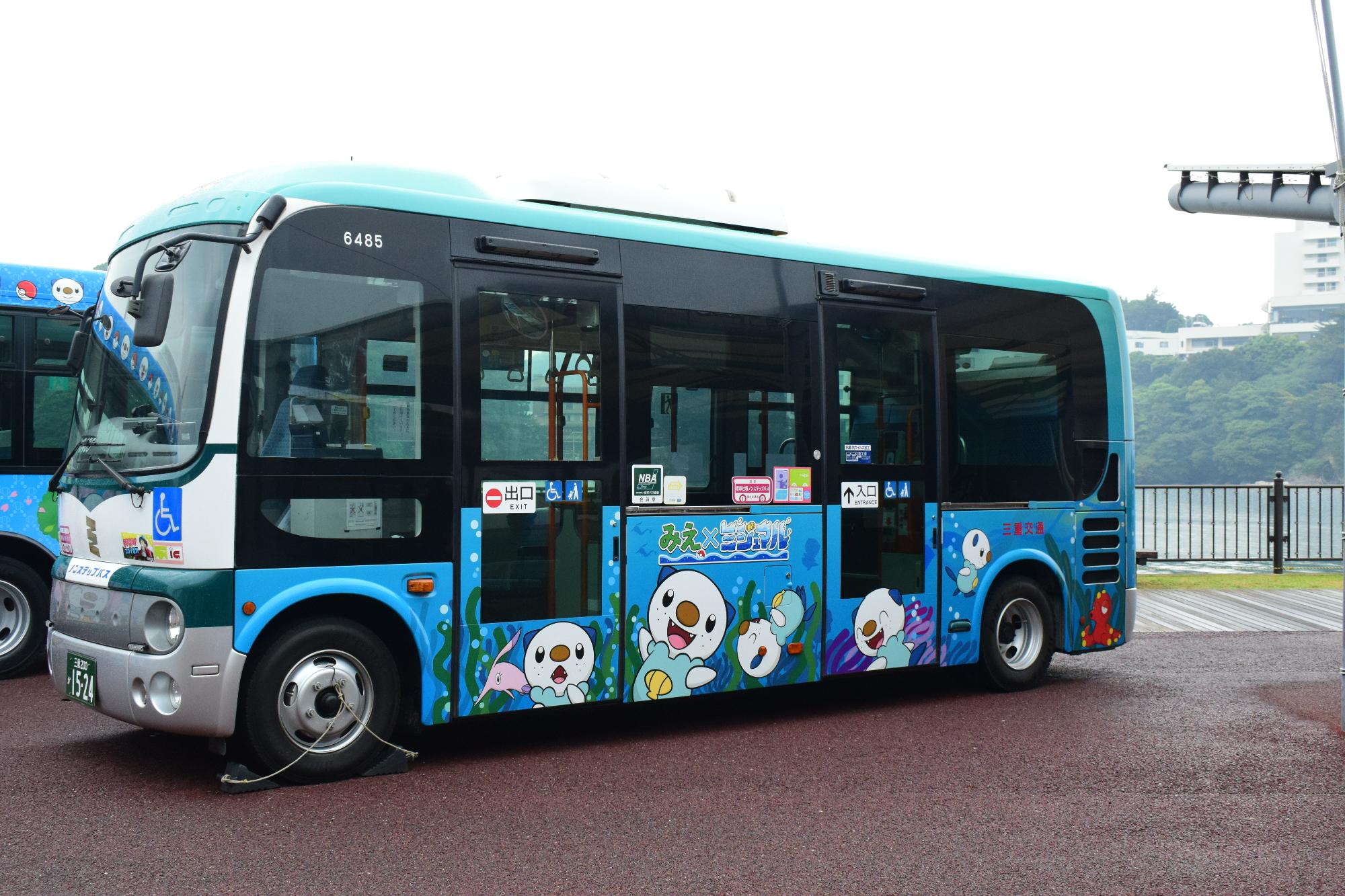 古くから海女文化が息づくまちである「鳥羽市」のイメージを活かし、水の中でミジュマルが遊んでいるような様子をイメージしたデザインになっています。背景には、鳥羽市に馴染みのある海藻類のモチーフと、バスのあちこちにさまざまなみずタイプのポケモンたちが隠れている楽しいデザインになっています。