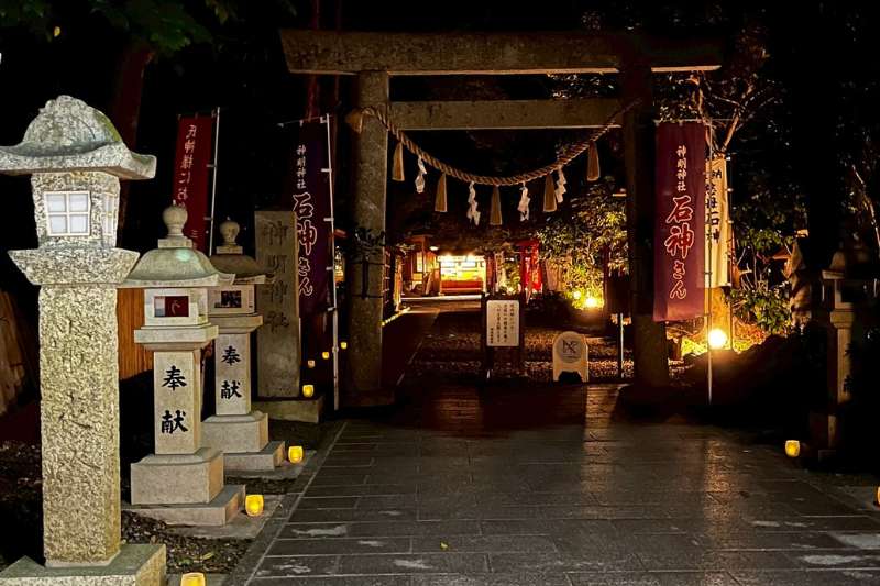 「石神さん夜参り(神あかり)」。女性の願いをひとつ叶えるといわれる神明神社の石神さんは、全国から多くの参拝者が訪れる女性に人気のパワースポットです。満月や新月の夜、参道がライトアップされる幻想的な空間で、願い事を祈願紙に書き、静かに心を整える特別な体験をお届けします。