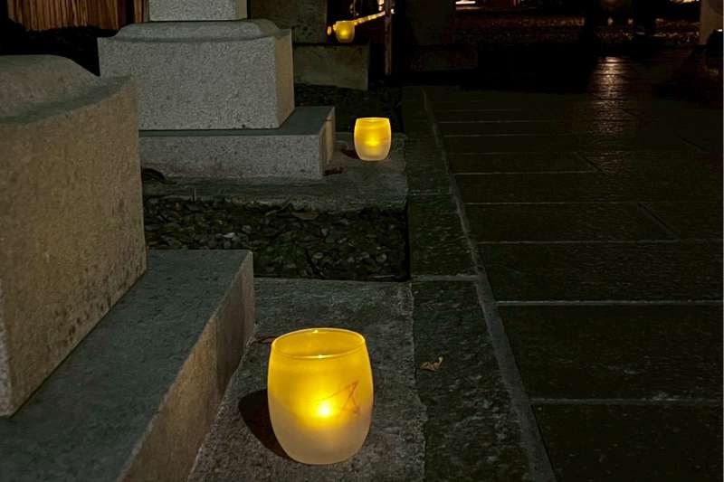 神明神社境内は、優しいキャンドルの光で照らされ、幻想的な雰囲気が漂います。
