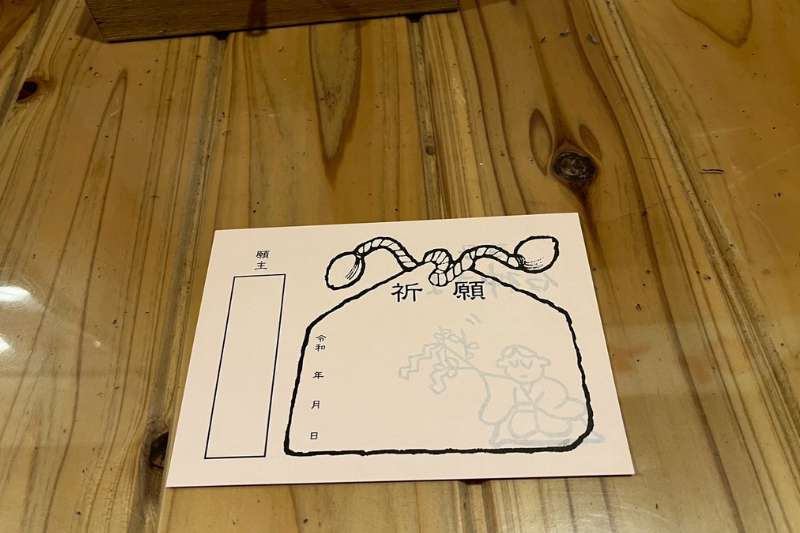 祈願紙に願い事を1つだけ書き、石神さんの前にある願い箱にそっと入れてお祈りを。
