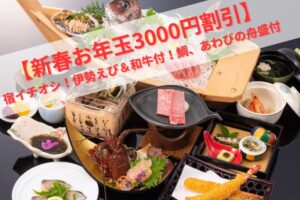 【新春お年玉3000円割引】宿イチオシ!伊勢えび&和牛付!鯛、あわびの舟盛付